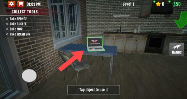 1、購買清潔工具:打開游戲后,點擊屏幕前的筆記本電腦,購買所需的清潔工具,為清理做準備。
