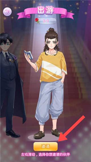 3、選擇出游互動:搭配好服飾后,點擊左側出游按鈕,選擇心儀的男神模樣,一起出游并換上美美的服裝。