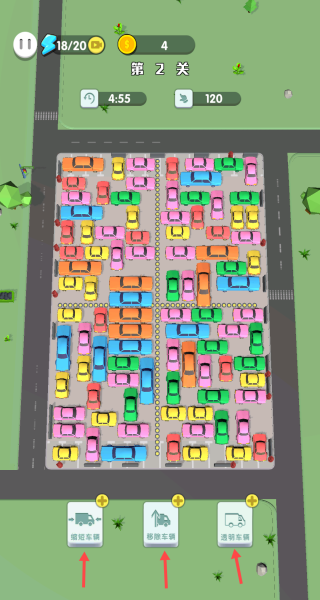 1、疏導交通挑戰:玩家需不斷疏導交通,避免堵塞,完成將所有車輛成功引導至停車場的關卡挑戰。