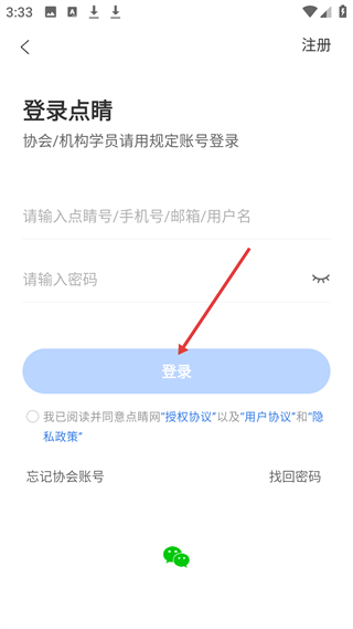 1、登錄界面可輸入點睛號、手機號等及密碼登錄,需同意相關協議,也可注冊、找回密碼,還有微信登錄選項。