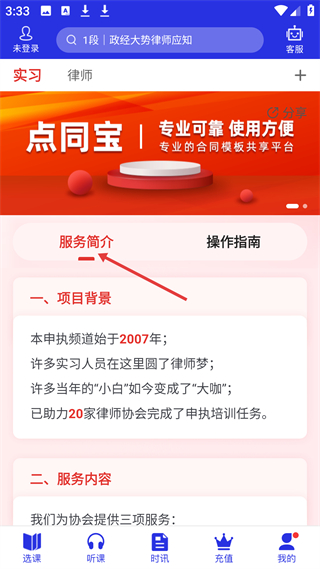 2、服務簡介頁面,介紹項目始于2007年,助力眾多實習人員成律師,助20家律協完成培訓,還會展示服務內容等信息。