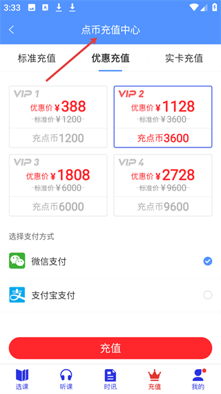 4、點幣充值中心,分標準、優惠、實卡充值,優惠充值有不同VIP檔位,如VIP2優惠價1128元充3600點幣,可選微信或支付寶支付。