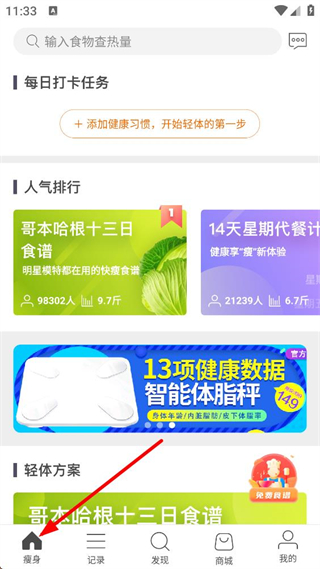 1、進入應用瘦身頁面可查看每日打卡任務、人氣排行及輕體方案等內容,點擊添加健康習慣相關入口,即可進入打卡習慣管理界面。