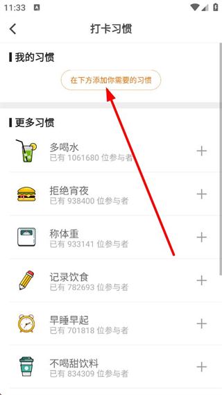 2、打卡習慣界面,可查看我的習慣并添加自定義習慣,也能從更多習慣中選擇熱門選項如多喝水、拒絕宵夜等加入打卡。