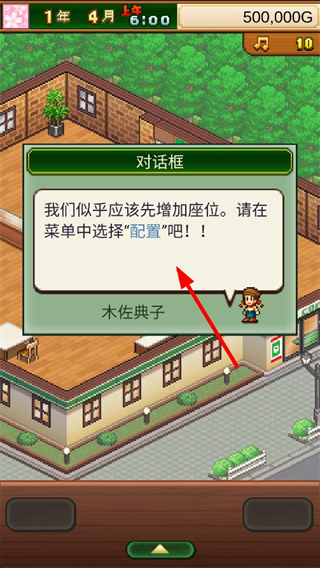 1、根據對話提示在菜單里選擇配置,優先增加座位來拓展餐廳的接待能力,助力后續經營。