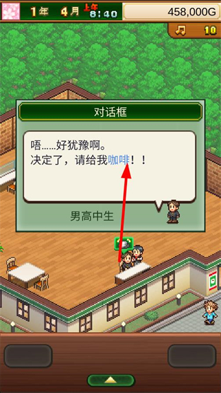 3、餐廳會迎來如男高中生等顧客,顧客會提出需求比如咖啡,根據需求提供對應的餐品,推進服務流程積累收益。