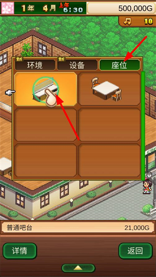 2、進入配置界面后選擇座位分類,可解鎖普通吧臺等設施,消耗對應資源即可添置,逐步完善餐廳的座位布局。