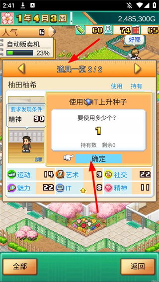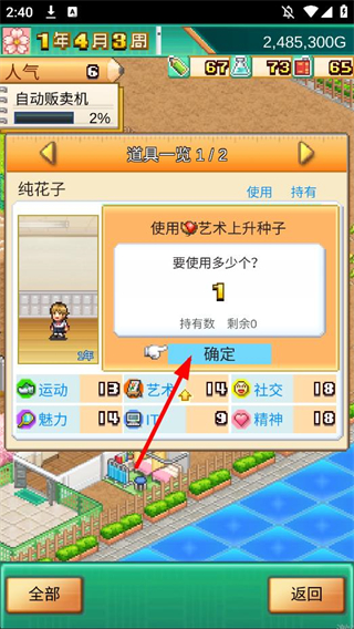 1、進入道具一覽界面,選擇對應種子使用,確定使用數量后點擊確定,可提升學生對應的學科能力數值。