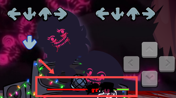 2、操控角色跳動:玩家使用左下角的方向鍵作為打擊按鍵,當屏幕上方的音符與對應方向的圖標重合時,按下相應方向鍵,操控角色隨著音樂節奏上下左右飛快跳動。