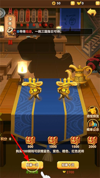 4、在深巷酒肆招募武將,點擊招募一次或招募十次,有機會獲得藍、紫、橙、紅色武將,增強陣容實力。