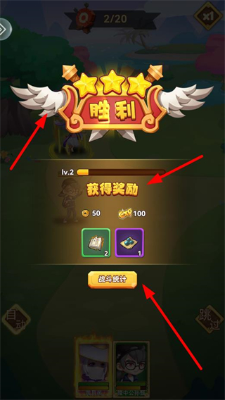 3、戰斗勝利后獲得金幣、將魂等獎勵,點擊戰斗統計查看戰斗詳情,提升武將等級,解鎖新武將和游戲內容。