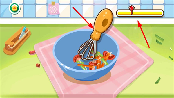 4、食材和調料都放入碗里后,使用攪拌工具攪拌碗內的材料,同時觀察上方進度條,直到進度條達到對應狀態,完成這一步的料理操作。