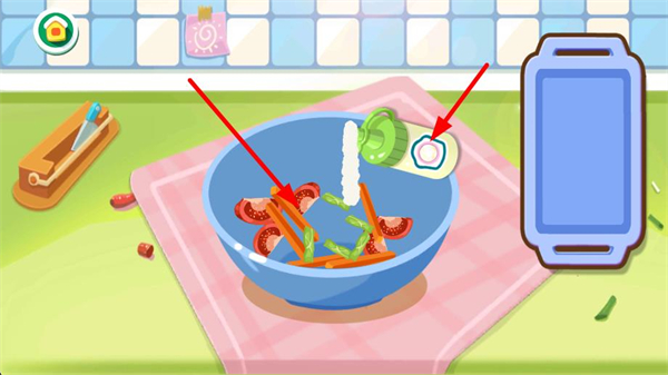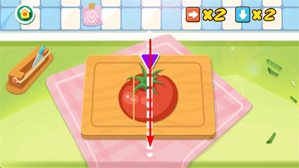 1、根據界面指引操作,將番茄放在砧板上,通過對應方向的操作,按照提示的切割位置對番茄進行切割,完成食材處理。