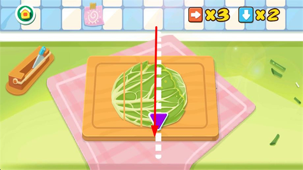 2、處理完番茄后,將卷心菜放到砧板上,繼續按照界面提示的切割位置,操作對應方向來切割卷心菜,完成這一食材的處理步驟。