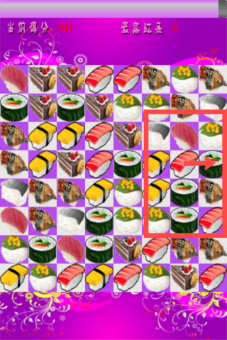 1、消除得分策略:仔細觀察壽司布局,選擇合適的相鄰壽司進行交換,盡可能一次性消除更多圖標,以獲得更高的積分加成。