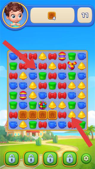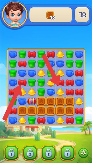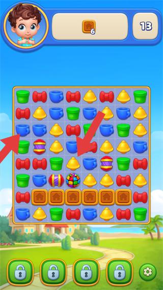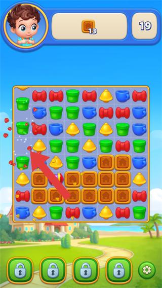 2、通過交換相鄰物品位置,讓三個及以上相同物品連成一線,就能消除它們,消除時會有特效,還能逐步解鎖下方帶鎖的物品區域。
