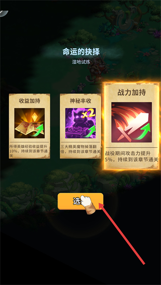 1、在命運的抉擇下可選擇戰力加持等增益效果,選擇后在戰役里獲得攻擊提升等加成,助力喵族戰斗。