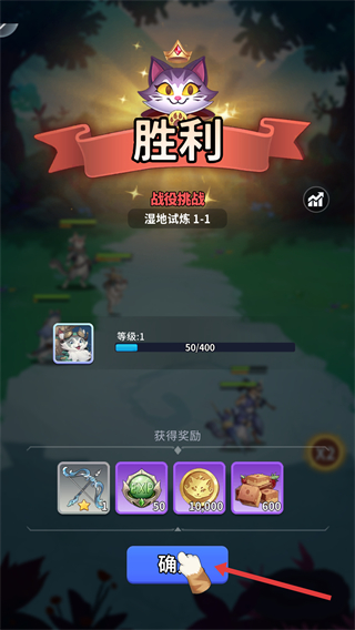 4、戰斗勝利后可獲得武器、道具、金幣等獎勵,點擊確定領取獎勵,不斷增強喵族實力,探索更多游戲內容。