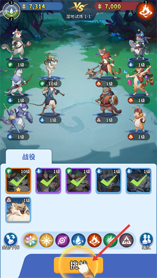 2、可查看戰役列表,選擇挑戰關卡,點擊挑戰按鈕,派出喵族角色與敵方戰斗,推進戰役進程。