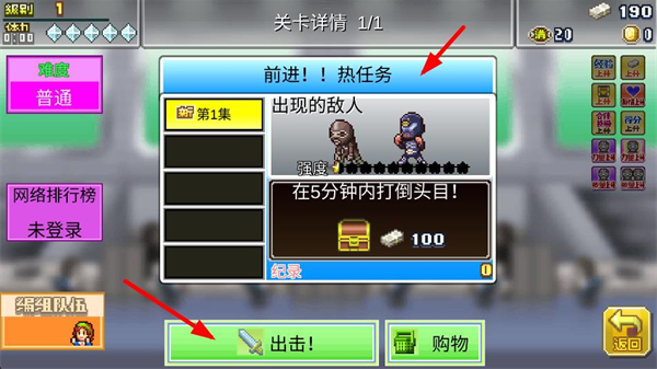 4、進入關卡界面,查看熱任務的敵人與目標后,點擊出擊按鈕,派遣隊伍在限定時間內擊敗頭目,獲取關卡獎勵。