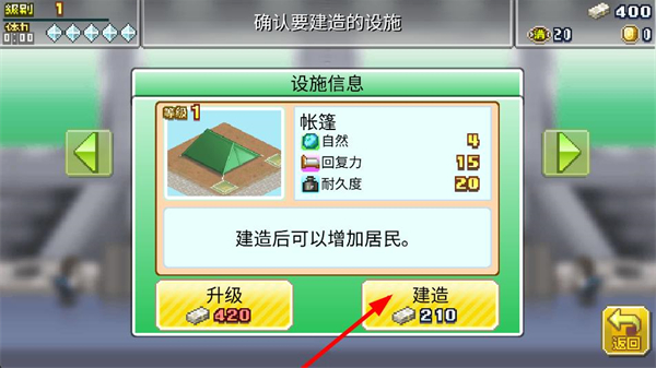 2、在設施建造界面,選擇帳篷設施,消耗資源點擊建造按鈕,完成后可增加居民數量,拓展城鎮規模。