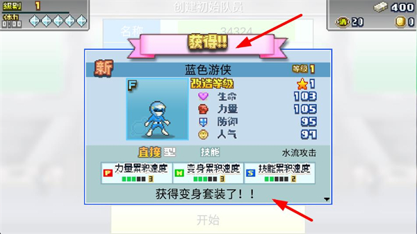 1、創建初始隊伍后,獲得藍色游俠角色及變身套裝,確認角色信息后即可開啟后續的冒險與建設流程。