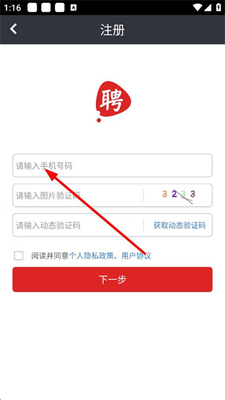 4、注冊時輸入手機號碼,完成圖片驗證和動態驗證,勾選同意隱私政策和用戶協議后點擊下一步,即可完成賬號注冊,參與富士康招聘流程。