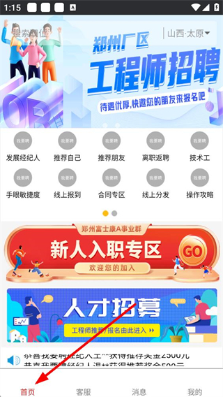 1、進入首頁,可查看鄭州廠區工程師招聘、新人入職專區等招聘信息,使用發展經紀人、推薦自己等招聘功能,了解各類操作攻略。