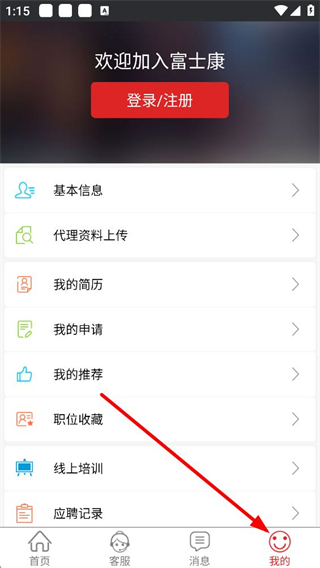 2、點擊我的進入個人界面,可進行登錄、注冊操作,管理基本信息、代理資料上傳、我的簡歷等求職相關內容,查看我的申請、推薦等記錄。