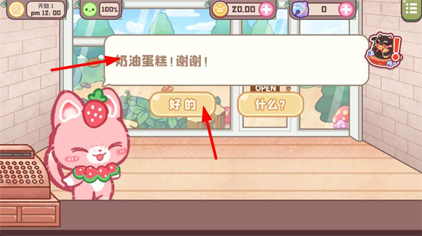 1、貓咪顧客說需要奶油蛋糕!謝謝!,點擊好的按鈕,確認顧客的訂單需求,開啟奶油蛋糕的制作流程。