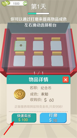 4、收購紀念幣后,可查看其物品詳情,選擇快速賣出獲取對應金額,也可通過打磨提升其價值再交易。