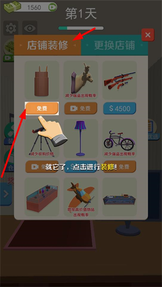 2、可進入店鋪裝修界面,選擇免費的裝修物品,點擊對應物品后選擇就它了進行裝修,提升當鋪的環境。