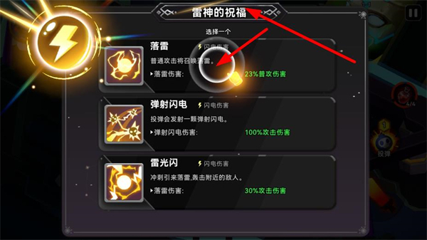 2、在雷神的祝福界面選擇一個技能,比如落雷,普通攻擊將召喚落雷造成對應傷害,助力提升戰斗過程的輸出效率。