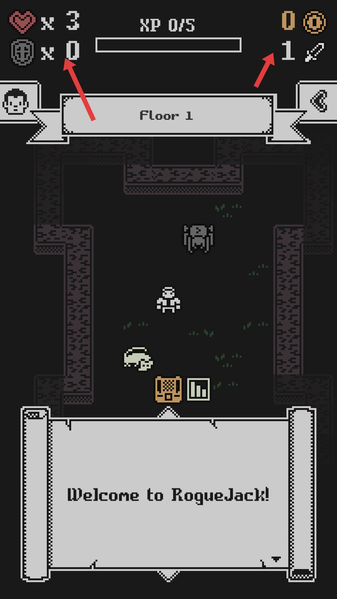 1、進入游戲,處于Floor1,關注生命值、經驗值等狀態,界面顯示歡迎玩家,開始探索地牢,準備應對怪物,收集資源提升實力。