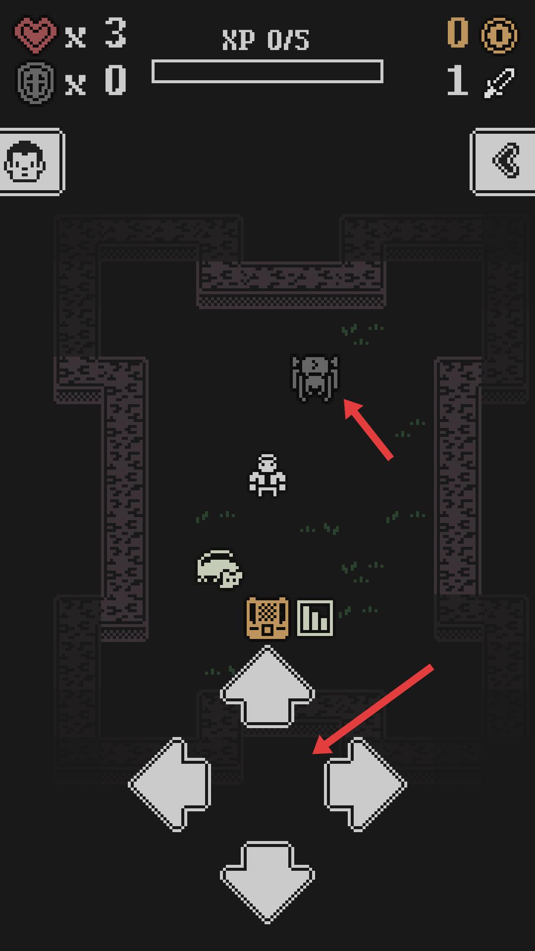 2、遇到蜘蛛怪物,通過方向鍵操控角色移動,靠近怪物觸發戰斗,移動時注意地牢地形,規劃好行進路線,為戰斗做好準備。