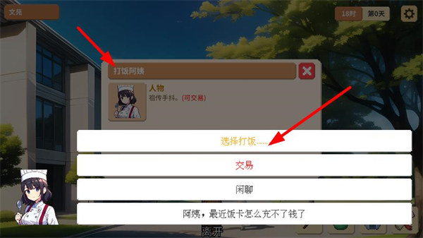 4、可與打飯阿姨互動,選擇打飯、交易、閑聊等選項,還能詢問飯卡充值問題,在文苑場景推進任務進程。