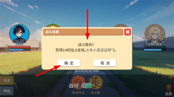 2、戰斗勝利后會彈出戰斗結果界面,顯示獲得經驗、金錢、火車小混混證明等獎勵,點擊確定可繼續游戲。