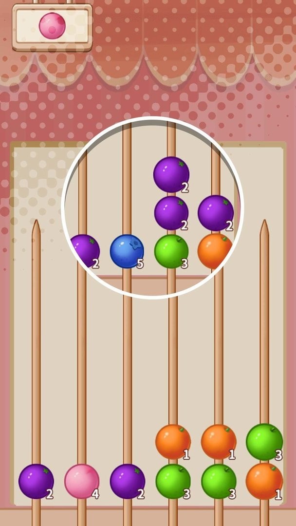 2、策略性空間管理:觀察當前小球顏色與簽子排列,預判后續球序,通過墊底層或集中消除保留關鍵位置,為高分數合并創造條件。