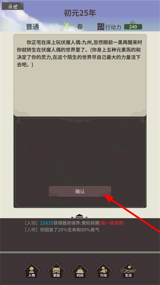 4、有劇情提示,如轉生到伏魔人偶世界,點擊確認,在初元25年等時間節點展開冒險,提升修為活下去。