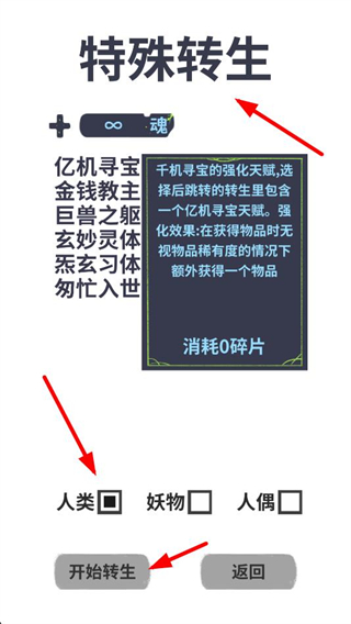 1、進行特殊轉生,選擇人類、妖物、人偶等種族,消耗魂等資源,點擊開始轉生開啟新的轉生旅程。
