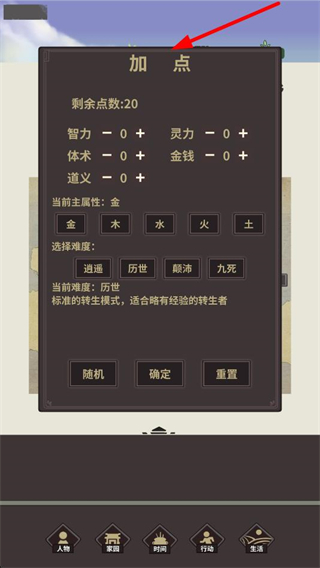3、有加點界面,可分配智力、體術、道義等屬性點,選擇主屬性和難度,設置好后點擊確定推進游戲。
