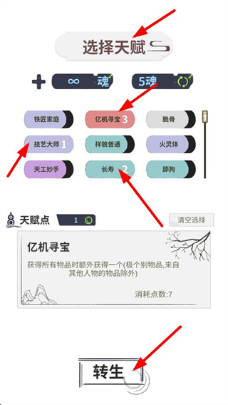 2、轉生后選擇天賦,如億機尋寶、技藝大師、長壽等,消耗天賦點,選好后點擊轉生,獲得相應天賦加成。