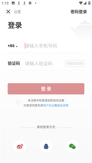 1、登錄頁支持手機號驗證碼登錄未注冊手機號自動注冊及微博、QQ、微信登錄,需同意用戶協議、隱私政策。