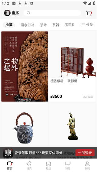 2、首頁設搜索欄,分類含酒水滋補、茶葉等,展示木雕、檀香紫檀疏影柜等文玩,還有登錄領666元優惠券活動。