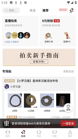 3、拍賣頁有直播拍賣、0元搶拍板塊,提供拍賣新手指南,展示小羅沉香專場等活動,21件拍品6次出價,方便參與文玩競拍。
