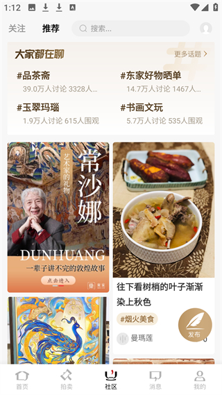 4、社區頁有品茶齋、玉翠瑪瑙等話題,展示常沙娜敦煌故事、煙火美食等內容,用戶可參與討論或發布內容。