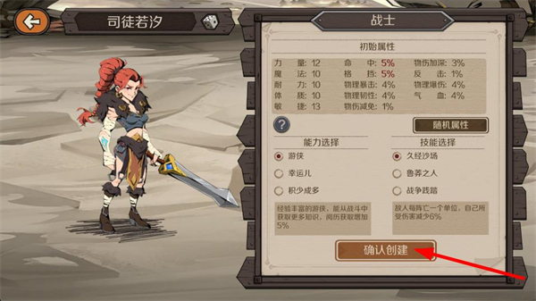 1、創建角色如戰士司徒若汐,選擇能力和技能,點擊確認創建,開啟蠻荒冒險之旅,定制角色發展方向。