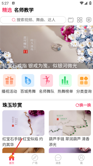 2、首頁設搜索欄與功能入口,展示推薦內容及分類板塊,涵蓋多類舞蹈資源,是綜合瀏覽操作的核心界面。