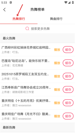 3、熱舞排行頁展示最火、最新熱舞列表,配備播放、緩存功能,是查看并操作熱門舞蹈作品的展示界面。