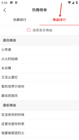 4、舞曲排行頁分最熱、最新舞曲分類,列出熱門舞曲名稱,是查找熱門舞蹈配樂的資源瀏覽與選擇界面。